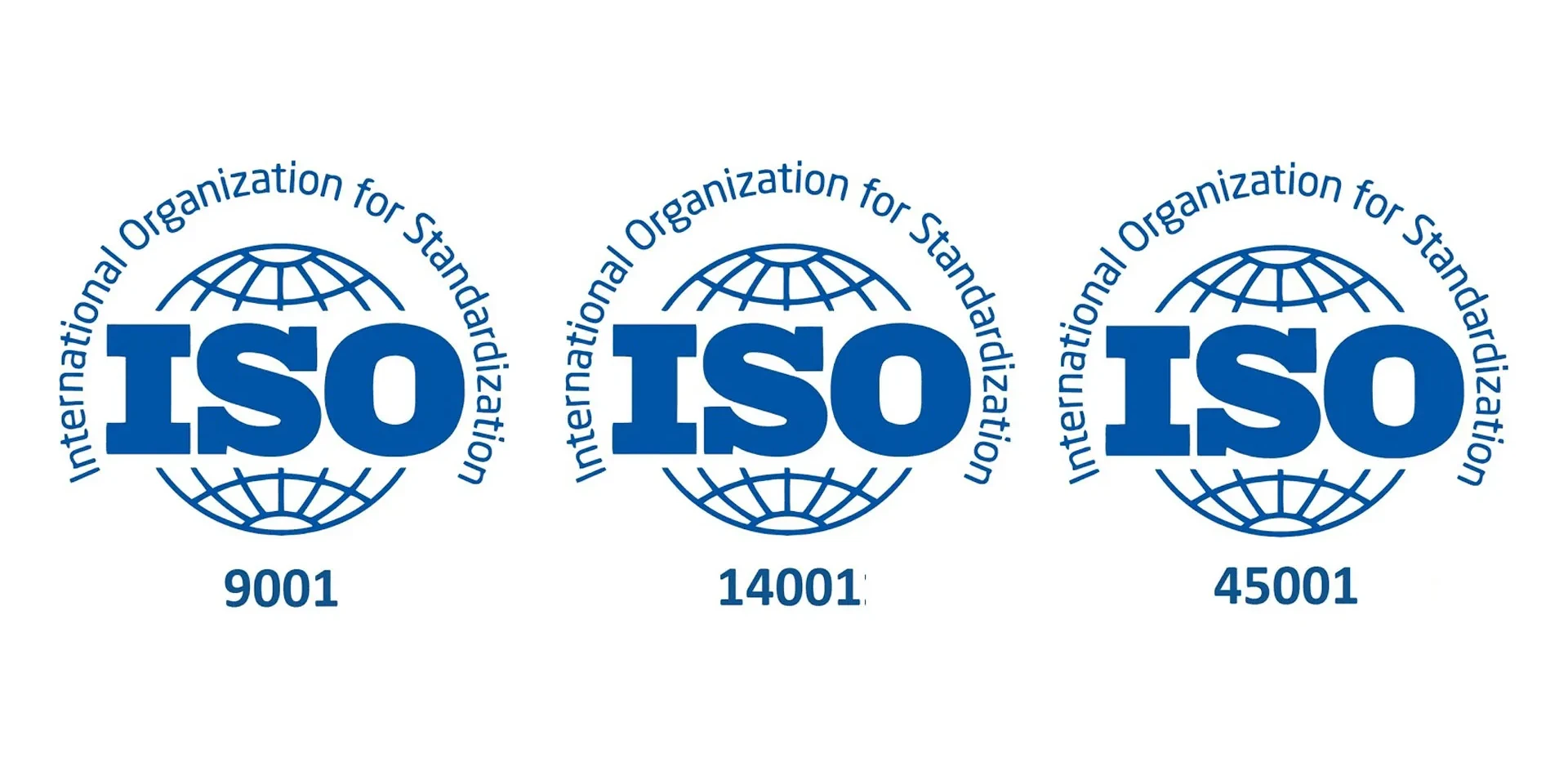 Norma ISO 9001 vigente, ISO 14001 vigente e ISO 45001 vigente.